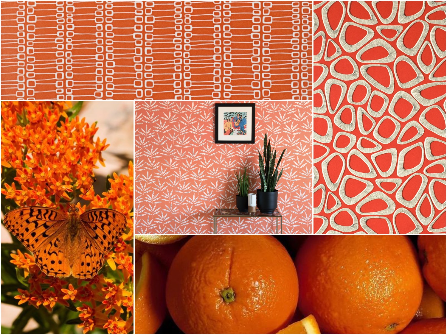 Orange is actually more versatile than people usually think, the Pea Pods wallpaper in terracotta can complement an existing interior scheme by adding a pop of visual interest to a room.