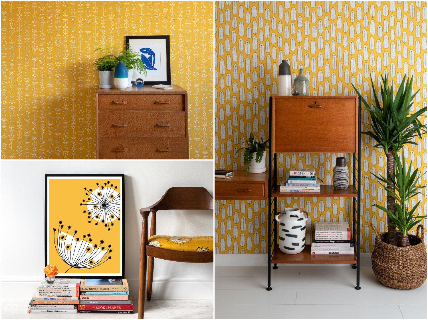 Yellow is often a colour associated with vintage style and interiors of bygone eras. The ideal combination, a vibrant yellow wallpaper can pair beautifully with a mid-century style sideboard, chest of drawers or shelves. Our Bloom Blossom Goldenberry wallpaper is the perfect example of how a modern, graphic pattern can work with a vintage piece of wooden furniture to create a truly on-trend scheme.