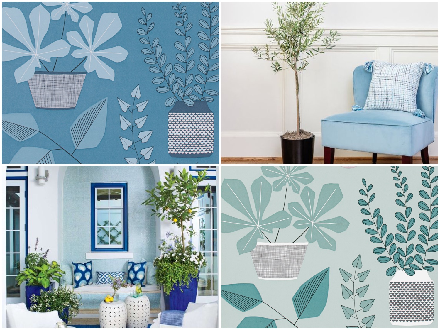 Pair olive trees with other natural plants to recreate the Mediterranean atmosphere we all crave for all year round. However, if caring for a variety of different plants isn’t your forte, opt for a substitution that can provide the same effect. The House Plants Blue Room wallpaper can give that biophilic feel, complementing your very own olive tree.